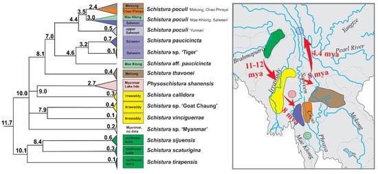 Part of time tree and geographic distribution of species in the poculi species group. The three species from northeast India were the first to become isolated, followed by the species in the Irrawaddy basin and Lake Inle in Myanmar. The radiation into the Mekong, Chao Phraya, Salween, and Mae Khlong then occured, indicating an eastward range extension of the group during the middle and late Miocene.