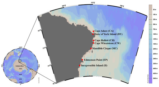 Sample sites for fecal DNA analysis in the Ross Sea region. Map view created by Ocean Data View software version 5.1.7 (Schlitzer, R., Ocean Data View, 2018, odv.awi.de, accessed on 23 December 2021).