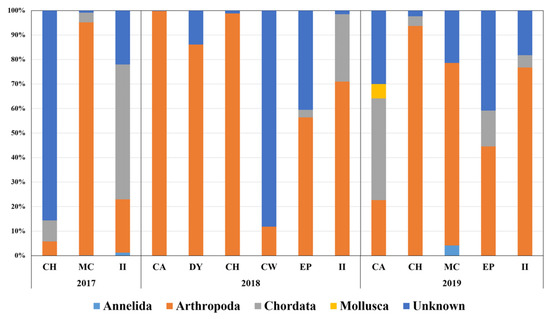 Metabarcoding of fecal DNA using 18Sv9 universal primer set. Graph displays proportions of phyla of prey items at different sites by year.