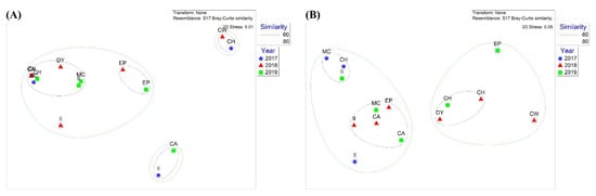 Nonmetric multidimensional scaling (NMDS) plot of (A) eukaryotic communities using 18Sv9 metabarcoding and (B) fish communities using miniFish metabarcoding in different years. Solid lines indicate 60% and 80% similarity.