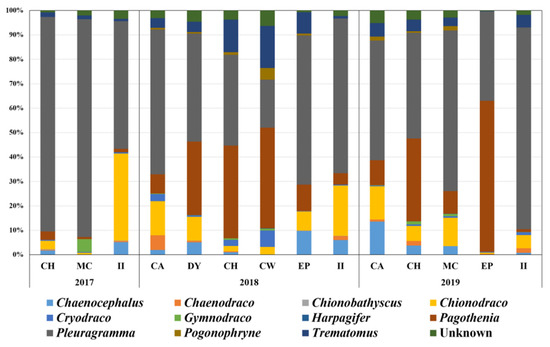 Five families (Nototheniidae, Channichthyidae, Artedidraconidae, Bathydraconidae, and Harpagiferidae) covering 11 genera (Chaenocephalus, Chaenodraco, Chionobathyscus, Chionodraco, Cryodraco, Gymnodraco, Harpagifer, Pagothenia, Pleuragramma, Pogonophryne, and Trematomus) were detected as piscine prey of Adélie penguins via miniFish metabarcoding (Table 5). Of 22 haplotypes, 12 showed 100% sequence identity, indicating a high number of reference sequences for fish species in the Ross Sea. However, species names were unable to be assigned to three haplotypes from Trematomus, Chinodraco, and Pogonophryne because of the low variability to distinguish the relative species in each genus (Table 5). Among the 11 genera, the Antarctic silverfish, P. antarctica, was the most abundant, accounting for 56.50% of total piscine reads, followed by Pagothenia borchgrevinki (18.20%), Chionodraco spp. (9.61%), and Trematomus spp. (5.15%).