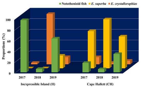 Proportions of main prey items (Notothenioid fish, Euphausia superba, and Euphausia crystallorophisa) in fecal DNA of Adélie penguins (Pygoscelis adeliae) at Inexpressible Island (II) and Cape Hallett (CH) for three successive years.