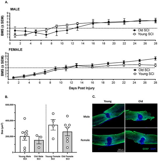 (A). Irrespective of age or sex all mice recovered locomotor function, assessed with the BMS scale, over 28 days post injury. There were no significant differences in recovery across groups. The Mean ± SEM for each group is shown across days, and the dashed line represents the score for plantar, weight supported stepping. (B). Similarly, age and sex did not affect lesion size at 28 days post injury. The white circles represent individual subjects. (C). Representative images of the lesion, visualized with GFAP and DAPI staining, from each demographic are shown. For BBB analyses (A), n = 5 old males, 11 young males, 8 old females, 8 young females. For lesion analyses (B), n = 3 old males, 6 young males, 7 old females, 4 young females.