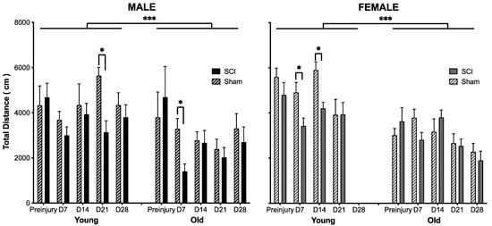 Age, sex and SCI affected open field activity. The young mice displayed greater activity in the open field than the old mice, with females also displaying increased activity relative to males. Not surprisingly, there was a main effect of SCI on activity. SCI reduced activity relative to sham controls, particularly in the early stage of injury (Day 7), irrespective of the demographic observed. Days (D) post injury are denoted on the x-axis, with the mean (±SEM) distance traveled in 10 min depicted on the y-axis. n = 4 sham and 5 SCI old males; 4 sham and 11 SCI young males; 8 sham and 7 SCI old females; 7 sham and 8 SCI young females. *** p < 0.0001 and * p < 0.01.