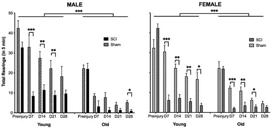 Age and SCI affected rearing activity. The young mice reared more than the old mice and SCI reduced rearing activity relative to sham controls, irrespective of the demographic observed. There was no effect of sex on rearing behavior. Days (D) post injury are denoted on the x-axis, with the mean (±SEM) number of rears in 5 min shown on the y axis. n = 4 sham and 5 SCI old males; 4 sham and 11 SCI young males; 8 sham and 7 SCI old females; 7 sham and 8 SCI young females. *** p < 0.0001, ** p < 0.001, * p < 0.01.