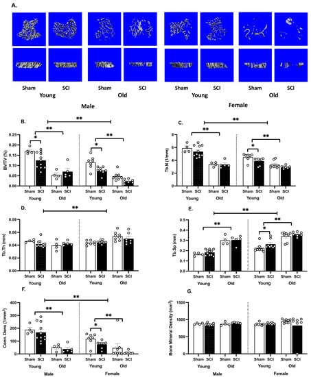 There were also main effects of age (F (1,19) = 126.90, p < 0.0001) and sex (F (1,27) = 5.44, p < 0.05), and no effects of injury on connective density (Figure 4F). There was also a significant interaction between injury and age on this parameter (F (1,19) = 6.80, p < 0.05). All young mice had greater connective density than their sex and injury matched conspecifics (t > 4.12, p < 0.0005 for all comparisons). Sex effects were seen in the SCI subjects only (t = 3.32, 2.27, for young and old SCI subjects respectively, p < 0.05). Specifically, an effect of injury was seen in the young females (t = 2.16, p < 0.05), with SCI decreasing connective density. No effects of sex, age, or SCI were seen on volumetric bone mineral density (Figure 4G).