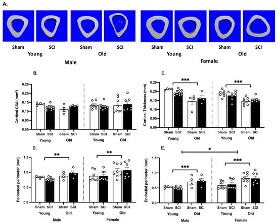 SCI did not affect cortical bone structure after only one month. (A). Coronal views of microCT 3D reconstructions of the 50 contiguous slices of the tibial mid-diaphysis from a representative mouse in each group. (B). There was also no effect of age or sex on cortical bone cross sectional area. (C). Age did, however, decrease cortical thickness and (D). increased the periosteal perimeter. (E). Both age and sex also affected the endosteal perimeter. The endosteal perimeter increased with age, and was larger in females than males. Means ± SEMs are plotted for each group. Individual subjects are shown with the round, white symbols. n = 4 sham and 5 SCI old males; 4 sham and 11 SCI young males; 8 sham and 7 SCI old females; 7 sham and 8 SCI young females. *** p < 0.001, ** p < 0.01, * p < 0.05.