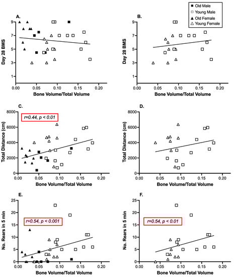 Pearson’s product-moment correlations were used to examine the relationship between trabecular bone volume and motor activity in the SCI subjects only. With no change in motor function, sham subjects were not included in these analyses. There was no correlation between BMS scores collected on Day 28 and trabecular bone volume (r = −0.14, p > 0.05, Figure 6A,B). However, both open field activity and rearing behavior were significantly correlated with trabecular bone volume (r = 0.44, 0.54 respectively, p < 0.01, Figure 6C,E). The correlation between open field activity and bone volume was driven by the young male subjects (r = 0.74, p < 0.005). Correlations between bone volume and activity were not significant for any other group. The correlation between rearing and bone volume was powered by the young subjects (r = 0.54, p < 0.01, Figure 6D,F), although at an individual group level the only correlation that was significant was for the old females (r = 0.74, p < 0.05).