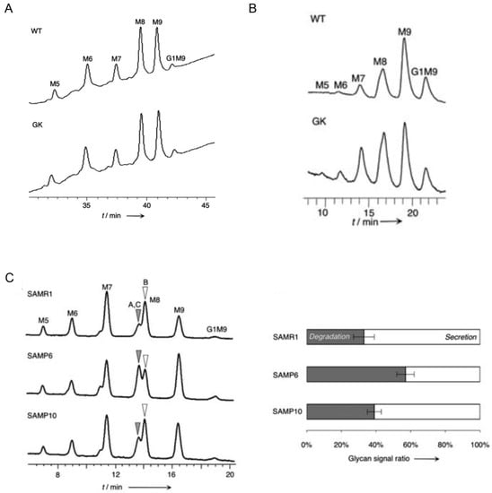 Importance of reconstructed glycan profiles in terms of detecting perturbation of glycoprotein ERQC. (A) Total glycan-processing analysis from isolated ER lysate did not detect differences in healthy (WT) and non-obese type 2 diabetes rat models (GK). Direct glycan profile reflects in situ glycan processing states in isolated ER lysate. In line with previous findings, contamination of ER-Golgi recycling glycoproteins was detected. This is one of reasons why perturbation of glycan profile is masked by the direct glycan profile method. (B) Compared to direct glycan profile, reconstructed glycan profiles can obtain time-dependent glycan profiles, because ER glycan processing is reconstructed in test tube, as described in Section 3.2. The method enables detection of slight differences of activity of glycan processing enzymes. This enables detection of the perturbation of glycoprotein ERQC. (C) Reconstructed glycan profiles in mouse models of misfolding diseases. The important findings are M8AGN2 and M8CGN2, degradation signals, increased in these mouse models. These figures are adapted from ref [101].