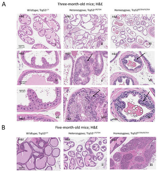 The Trp53R270H mutant allele promotes the development of prostatic intraepithelial neoplasia (PIN). At ~3 months of age, areas of metaplasia and atypical hyperplasia (arrows) were observed in heterozygous mice (Trp53+/R270H; Aii,v,viii) and grade 1 PIN lesions were observed in homozygous mice (Trp53R270H/R270H; Aiii,vi,ix) but not wildtype mice (Trp53+/+; Ai,iv,vii). PIN lesions (arrows) were observed in older Trp53+/R270H and Trp53R270H/R270H; mice (~5 months of age, Bii,iii, respectively). At ~5 months of age, grade 1 and grade 3–4 PIN lesions were observed in heterozygous and homozygous mice, respectively (Bi,ii). PIN lesions were not observed in Trp53+/+ (wildtype) mice at either time point (Ai,Bi). The combined data further confirm that the Trp53R270H mutation can drive initiation of prostate carcinogenesis. Please note that a representative scale bar is included in the first image for each horizontal panel.