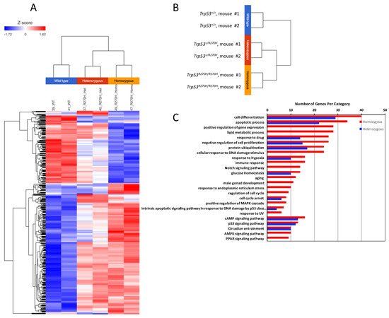 RNA-seq analysis demonstrates that presence of the Trp53R270H mutant allele is able to alter the transcriptional response of prostate cells to 5 Gy radiation. A distinct difference in gene expression patterns was observed between wildtype mice (Trp53+/+) versus heterozygous mice (Trp53+/R270H) and between wildtype mice (Trp53+/+) versus homozygous mice (Trp53R270H/R270H); heatmap (A), hierarchical clustering (B), and gene ontology (C) analyses. Differences between heterozygous and homozygous mice were also observed.