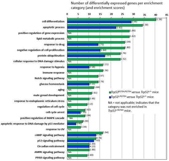 Gene enrichment analysis and gene dosage effects. Comparison of differential gene expression in Trp53 R270H homozygous versus wildtype mice and in Trp53 R270H heterozygous versus wildtype mice by gene enrichment category demonstrates that gene dosage differences exist for many, but not all of the categories. Gene enrichment scores are shown in brackets.