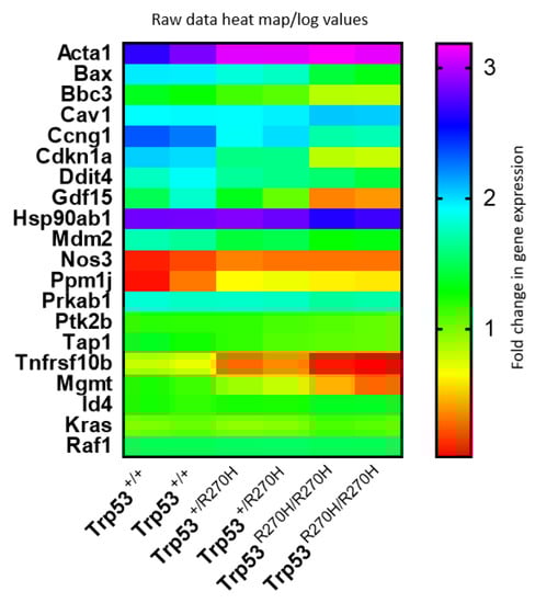 Heat map visualization of relative expression levels of genes listed in Table 1 and Table 2 (Figure 4) further confirms that gene dosage effects occur for many, but not all, of these genes, and that the relative impact of the p53 R270H mutant on gene expression varies widely between genes. This visualization also further confirmed that gene expression levels are very similar for each of the two mice in each group (Trp53+/+ (wildtype), Trp53+/R270H (heterozygous), and Trp53R270H/R270H (homozygous for the Trp53 mutation)).