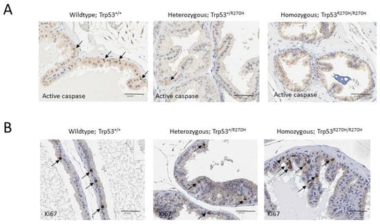 IHC analyses were conducted to determine the impact of the Trp53 R270H mutation on irradiation-mediated apoptosis and cell proliferation. Irradiation is well known to impact both of these processes via both p53-dependent and p53-independent processes [42]. Apoptosis was assessed via activated caspase IHC, and cell proliferation was assessed via Ki67 IHC. Approximately 5% of cells in prostates from wildtype mice (Trp53+/+) expressed active caspase 3, compared to only ~1% of cells in prostates from heterozygous mice (Trp53+/R270H) (Figure 5A). Less than 1% of cells in prostates from homozygous mice (Trp53R270H/R270H) expressed active caspase 3. No differences in the number of cells expressing Ki67 were observed; approximately 2–5% of cells were Ki67 positive in all three groups of mice (Figure 5B). These data indicate that the Trp53 R270H mutant impacts apoptosis related-pathways to a greater extent when compared to cell proliferation-related pathways. This finding aligns with the gene ontology analysis of our RNA-seq data, which show more apoptosis-related genes were differentially expressed in the homozygous and heterozygous mice when compared to cell proliferation-related genes (Figure 2B).