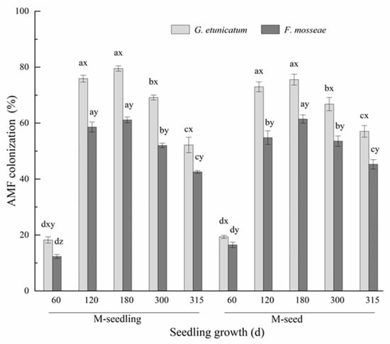 Root colonization rate of C. migao seedlings under 6 different treatments (the root colonization rate of NM was 0). Different lowercase letters (x, y, z) in the same d of seedling growth (x-axis) indicate the result of Tukey’s post hoc test at the 95% confidence level between treatments. Other different letters (a, b, c, d) indicate significant differences between different stages under the same treatment (p < 0.05). NM, non-AMF plants; G. etunicatum, plants inoculated with G. etunicatum; F. mosseae, plants inoculated with F. mosseae; M-seedling, inoculated by the seedling method; M-seed, inoculated by the seed method. Values are expressed as the mean ± SE (n = 6, which are treatment replicates).