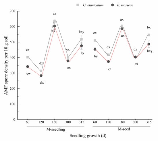 AMF spore density per 10 g soil of C. migao seedlings under 6 different treatments (there are no AMF spores of NM). Different lowercase letters (w, x, y, z) in the same d of seedling growth (x-axis) indicate the results of Tukey’s post hoc test (p < 0.05) between treatments. Other different letters (a, b, c, d) indicate significant differences between different stages under the same treatment (p < 0.05). NM, non-AMF plants; G. etunicatum, plants inoculated with G. etunicatum; F. mosseae, plants inoculated with F. mosseae; M-seedling, inoculated by the seedling method; M-seed, inoculated by the seed method. Values are expressed as the mean ± SE (n = 6, which are treatment replicates).