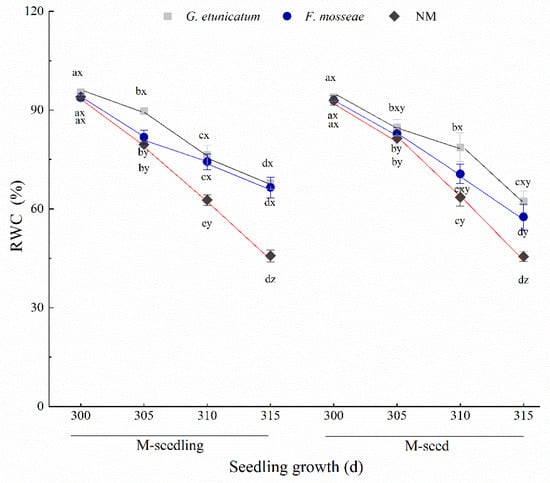Relative water content (RWC) of C. migao seedlings under 6 different treatments. Different lowercase letters (x, y, z) in the same d of seedling growth (x-axis) indicate the results of Tukey’s post hoc test (p < 0.05) between treatments. Other different letters (a, b, c, d) indicate significant differences between different stages under the same treatment (p < 0.05). NM, non-AMF plants; G. etunicatum, plants inoculated with G. etunicatum; F. mosseae, plants inoculated with F. mosseae; M-seedling, inoculated by the seedling method; M-seed, inoculated by the seed method. Values are expressed as the mean ± SE (n = 6, which are treatment replicates).