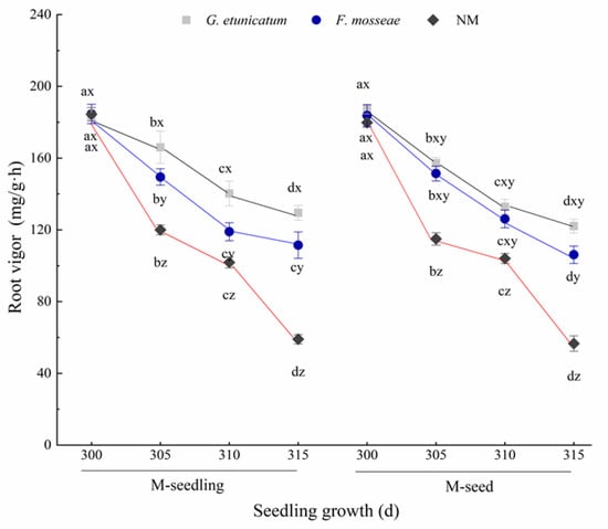 Root vigor of C. migao seedlings under 6 different treatments. Different lowercase letters (x, y, z) in the same d of seedling growth (x-axis) indicate the results of Tukey’s post hoc test (p < 0.05) between treatments. Other different letters (a, b, c, d) indicate significant differences between different stages under the same treatment (p < 0.05). NM, non-AMF plants; G. etunicatum, plants inoculated with G. etunicatum; F. mosseae, plants inoculated with F. mosseae; M-seedling, inoculated by the seedling method; M-seed, inoculated by the seed method. Values are expressed as the mean ± SE (n = 6, which are treatment replicates).