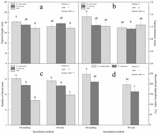 AMF colonization positively affected the taproot length and number of lateral roots, but not the taproot diameter (Figure 6 and Figure S5). Two-way ANOVA revealed significant independent effects of AMF status on taproot length, but no effects due to method or their interactions (Figure 6a). G. etunicatum colonization had the greatest positive effect on taproot length. Two-way ANOVA revealed that the number of lateral roots was significantly affected by AMF status and the interaction between AMF status and inoculation method (Figure 6c). There was a strong significant positive effect due to AMF status (p < 0.01). Moreover, when compared to NM, G. etunicatum colonization increased the number of lateral roots by 89.58% when inoculated by the M-seedling method. MDI is an estimation of plant responses to mycorrhizal colonization in terms of biomass enhancement [42]. The results revealed that MDI was significantly affected by AMF status and inoculation method individually, but not by their interactions (Figure 6d). Growth differences were more evident in AMF plants inoculated by the M-seedling method, where the MDI values were 248% and 210% higher under drought stress after colonization with G. etunicatum and F. mosseae, respectively.