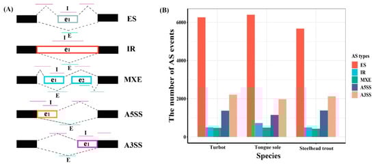 To construct the AS landscapes in the livers of turbot, tongue sole and steelhead trout, a total of 18 RNA-Seq datasets (six datasets from each fish) were selected and analyzed in the present study. The raw data of RNA-Seq derived from NCBI SRA database were converted to FASTQ format using SRA Toolkit v 2.9.0. Quality trimming and adapter clipping were performed to provide clean reads using fastp v0.23.2 with default parameters. The qualities of clean reads was further assessed using FastQC v0.11.9. The reference genomes and their corresponding annotation files of turbot, tongue sole and steelhead trout were also obtained from NCBI database with the assembly number of GCA_013347765.1, GCA_000523025.1 and GCA_002163495.1, respectively. High-quality clean reads of turbot, tongue sole and steelhead trout were then aligned to their corresponding reference genomes using Hisat2 v2.2.1 with default parameters. The aligned results were strictly filtered, and only unique alignments were retained for subsequent analysis. Reference-based transcript assembly was performed using StringTie v2.1.7. AStalavista v4.0 was utilized to automatically characterize the complete landscapes of AS events in the livers of the three species. The five typical AS events were defined by specific codes, including “0, 1-2^” for ES, “0, 1^2-” for IR, “1-2^, 3-4^” for MXE, “1^, 2^” for A5SS and “1-, 2-” for A3SS.