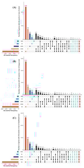 Additionally, we found that the 10,826, 10,741 and 10,112 AS events were derived from 5281, 5516 and 5614 functional genes, demonstrating that numerous genes may undergo at least two different AS events. The intersections between genes and their AS events in three species were intuitively visualized through the construction of UpSet plots, as shown in Figure 2A–C. The results clearly showed that most genes in turbot, tongue sole and steelhead trout only produced single AS events. Nevertheless, 64 genes in turbot, 58 genes in tongue sole and 42 genes in steelhead trout had the ability to produce greater than three different AS events.