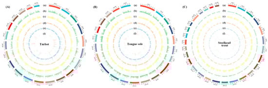 The distribution of protein-coding genes and AS events across the whole genomes of turbot (A), tongue sole (B) and steelhead trout (C). The bar plots from the outer to inner were used to represent the: (a) genome karyotype; (b) distribution of all the protein-coding genes; (c) distribution of protein-coding genes with AS events; (d) distribution of all the AS events; (e) density of AS events (AS event number/gene number); and (f) AS hotspot distribution. The distribution of both genes and AS events were calculated within non-overlap 200 kb bins.