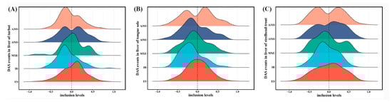Inclusion level differences of DAS events in the livers of turbot (A), tongue sole (B) and steelhead trout (C) between low- and high-salinity groups. These differences indicate the inclusion levels of low-salinity relative to high-salinity groups.