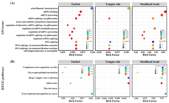 Enrichment analysis was performed to explore the potential functions of all the DAS genes in the livers of all three species. These GO terms and KEGG pathways, commonly enriched in at least two fish and ranked in top 30, were displayed in Figure 5. The results clearly indicated that many DAS genes were primarily enriched in some GO terms associated with the biological processes of RNA processing, such as mRNA binding, mRNA processing, mRNA splicing, via spliceosome, RNA splicing, regulation of mRNA metabolic, regulation of RNA splicing and so on (Figure 5A).