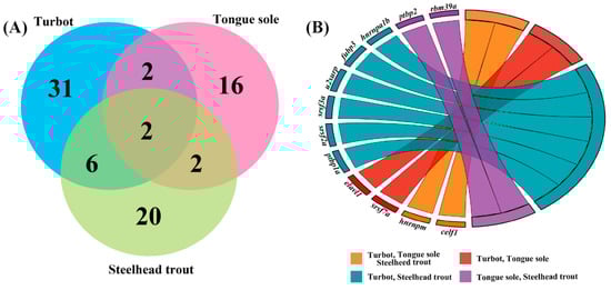 Common DAS genes associated with RNA processing in the livers of turbot, tongue sole and steelhead trout under different salinity environments. (A) Venn diagram showing the numbers of common DAS genes among three species. (B) GOChord plot of the relationship between the list of common DAS genes and their corresponding species classification. The full names of common DAS genes are given in Supplementary Table S8.
