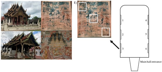 Buak Krok Luang Temple (A), mural painting of the Buak Krok Luang Temple (B), Tha Kham Temple (C), mural painting of the Tha Kham Temple (D) and sampling areas within the temples, the white frames demonstrate 3 sampling replications in each area (E).