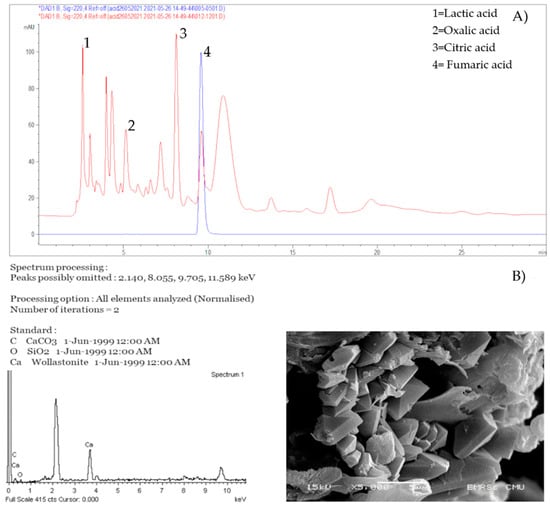 Acid production of Aspergillus fumigatus (red peak) compared with fumaric acid standard (blue peak) (A) and Calcium formation and EDS analysis of Aspergillus piperis (B).