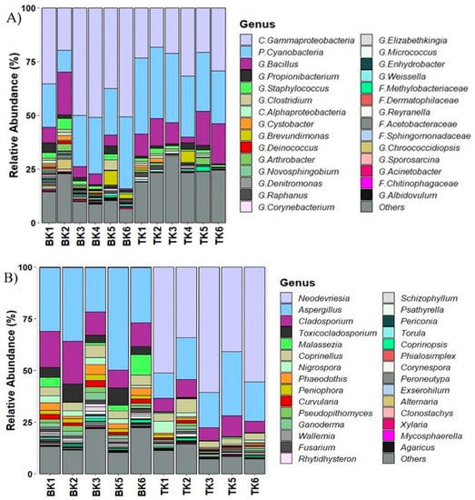Microbial community composition of bacteria (A) and fungi (B) from two mural paintings from Buak Krok Luang temple (BK) and Tha Kham temple (TK). The stacked bar-plots were derived from high-throughput sequencing data.