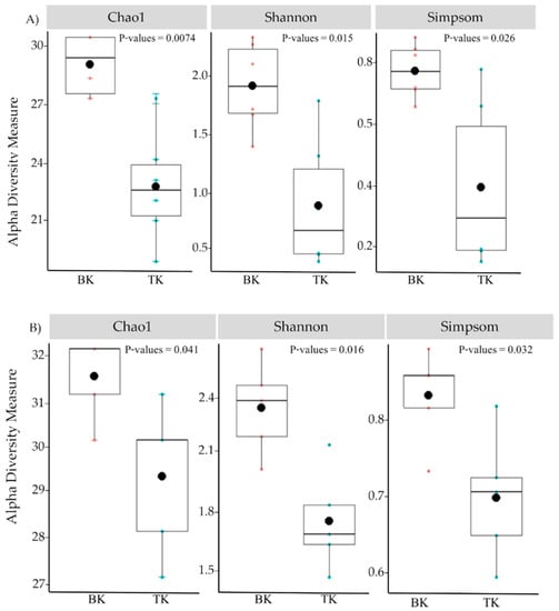 Alpha diversity of bacteria (A) and Fungi (B) of mural paintings according to Chao1, Shannon and Simpson indices in samples collected from Buak Krok Luang Temple (BK) and Tha Kham Temple (TK), black dots and error bar represent the means and Standard deviation of each barplot.