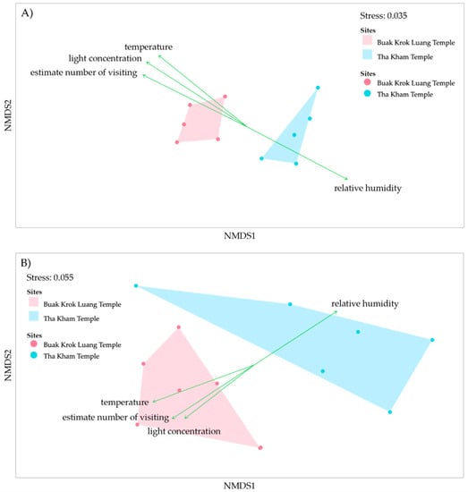 The non-metric multidimensional scaling (NMDS) was calculated based on Bray-Curtis indexes to analyze the difference between microorganism communities in the two locations. The result illustrates that the bacterial and fungal community compositions between the two temples were distinguished from each other (Figure 6A,B). The stress of the bacterial and fungal NMDS, indicative of deviation, is 0.035 for bacteria and 0.055 for fungi. The data collected for each temple including estimated number of visitors, relative humidity (RH), light concentration and temperature were used to determine the microorganism diversity. The results showed that the environmental factors were the dominant factors that caused the differences in the microorganism diversity.