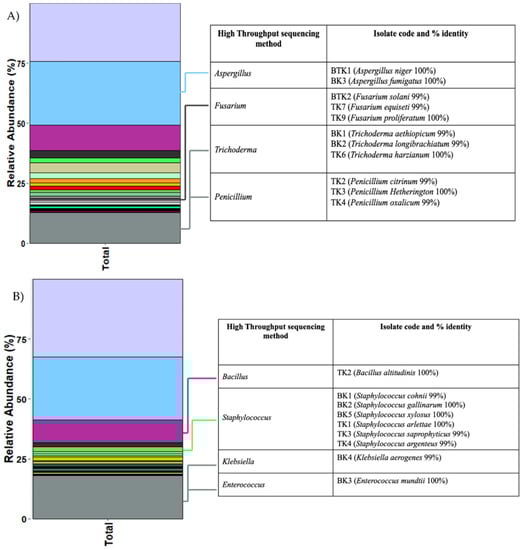 Sequences of fungal and bacterial isolates from the culture-dependent method were compared to the data from the high-throughput sequencing method. This enabled us to reasonably identify the fungi and bacteria from Illumina sequencing. The fungal taxa from Illumina (MiSeq) sequencing were matched with the isolates including Aspergillus, Trichoderma, Fusarium and Penicillium. Aspergillus was the dominant taxa in the fungal community. However, they made up of only 11% (2/17) based on the results from the culture dependent method. Fusarium was found at 1% based on the high-throughput method but at 17.6% based on the culture-dependent method. Trichoderma and Penicillium made up <1% of the fungal community (Figure 7A). Both methods showed that Staphylococcus sp. and Bacillus sp. were the dominant groups. Klebsiella and Enterococcus sp. were less abundant based on high-throughput sequencing, but they were found more frequently in the culture-dependent method. (Figure 7B)