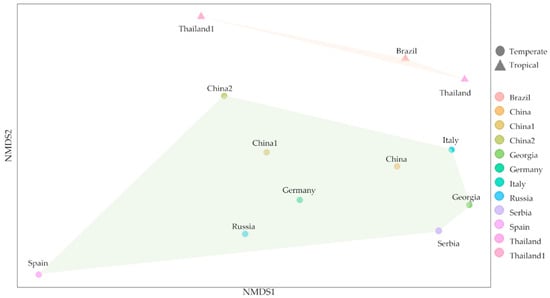 Microorganism diversity comparison among different countries. The triangles are communities from tropical countries (Thailand and Brazil), while circles are communities from temperate countries (China, Georgia, Germany, Italy, Russia, Serbia and Spain).