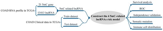 Colon adenocarcinoma (COAD) is the most commonly diagnosed colorectal cancer []. The main treatments for COAD include surgery, chemotherapy, radiation therapy, immunotherapy, etc. With the continuous development of treatment, the overall prognostic efficacy of COAD patients has improved dramatically [,]. Chemotherapy can be performed as adjuvant therapy following surgery or neoadjuvant therapy before surgery in advanced COAD patients to decrease the tumor []. Nevertheless, about 40~50% of advanced COAD patients die from recurrence and metastasis of the disease []. Several prognostic signatures have been created to predict drug sensitivity and prognostic efficacy in COAD attributing to the development of RNA sequencing technologies [,]. However, no predictive signature combining 5-methylcytosine (5mC)-related long non-coding RNA (lncRNA) and clinical data has been available for COAD patients to use. Hence, there is an urgent need to construct a novel predictive signature for COAD patients that can potentially identify new treatment targets and prognostic markers.