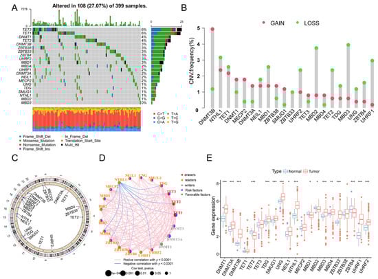 The genetic variation landscape of the 5mC regulatory genes in COAD patients. (A) 108 of the 399 COAD patients demonstrated genetic alters in 21 5mC regulators at a frequency of 27.07%. In each column indicates one patient and the numbers to the right represent the incidence of gene mutations. (B) the CNV frequency of COAD patients. The column represents the genetic variation, pink dots depict amplification mutations, and green dots depict deletion mutations. (C) The location of CNV alteration of 5mC regulatory genes on chromosomes. (D) The interaction of 21 5mC regulatory genes. Red, orange, and grey represent erasers, readers, and writers respectively. (E) Comparison of the mRNA expression levels of 21 5mC regulatory genes in normal and COAD samples. * p < 0.05, ** p < 0.01, *** p < 0.001.