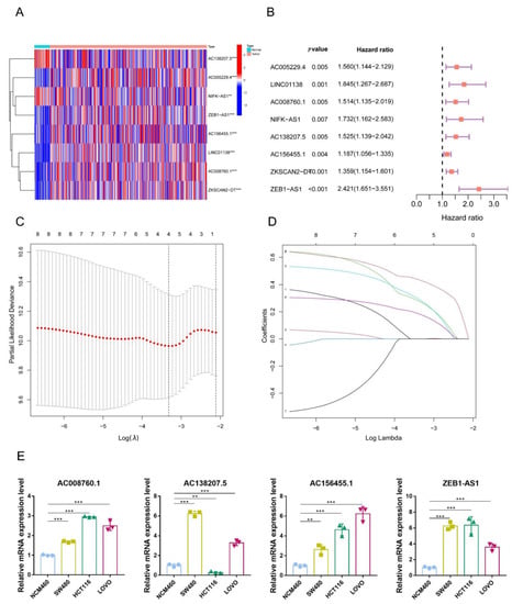 The establishment of the 5mC-related lncRNA signature. (A) The expression of selected 5mC-related lncRNAs correlated with survival was depicted by a heatmap utilizing univariate Cox regression. (B) The forest map represented the eight 5mC-related lncRNAs that were shown to be significantly associated with prognosis using univariate Cox regression. (C) LASSO coefficients for a four 5mC-related lncRNA. (D) The selection of the optimal parameters for COAD using the LASSO model. (E) Expression levels of AC008760.1, AC138207.5, AC156455.1, and ZEB1-AS1 in normal human intestinal epithelial cells (HCM460) and colorectal cancer cells (SW480, HCT116, LOVO). ** p < 0.01, *** p < 0.001.
