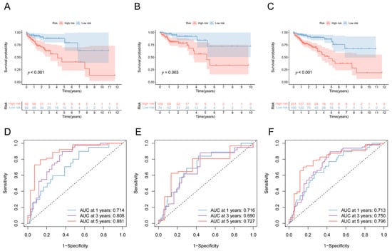 The Kaplan–Meier and ROC curve analyses for the lncRNA signature associated with 5mC. (A) In the training dataset, Kaplan–Meier survival curves for high-risk and low-risk subgroups. (B) In the testing dataset, Kaplan–Meier survival curves for high-risk and low-risk subgroups. (C) In the complete dataset, Kaplan–Meier survival curves for high-risk and low-risk subgroups. (D) The risk model’s receiver operator curve in the training dataset. (E) The risk model’s receiver operator curve in the testing dataset. (F) The risk model’s receiver operator curve in the complete dataset.