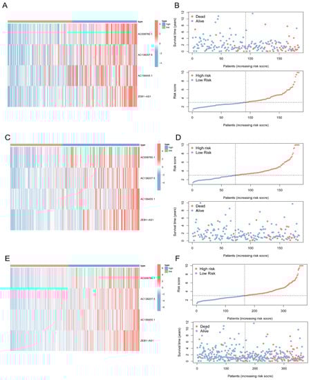 Evaluation of the lncRNA signature associated with 5mC. Heatmap revealing the expression of 4 5mC-related lncRNAs in the training dataset (A), testing dataset (C), and complete dataset (E), separately. Distribution of the lncRNA signature associated with 5mC risk scores and patterns of survival time and status in high-risk and low-risk subgroups in the training dataset (B), testing dataset (D), and complete dataset (F).