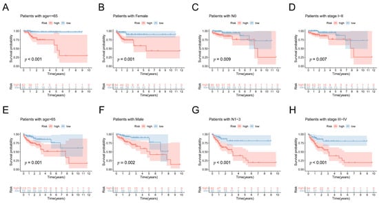 The predictive efficacy of the lncRNA signature associated with 5mC. Kaplan–Meier survival curves are classified by clinical characteristics, comprising age (A,E), gender (B,F), grade (C,G), and staging (D,H) in the complete dataset.