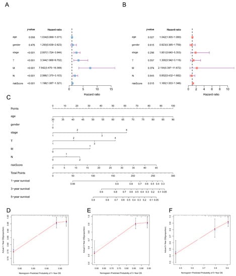 Independence and nomogram of the lncRNA signature associated with 5mC. The risk model’s independence was tested using (A) univariate and (B) multivariate Cox regression. (C) Based on clinical features and risk scores, a nomogram was applied to forecast the predictive capacity of overall survival in the complete dataset. The calibration plots of the nomogram for 1 (D), 3 (E), and 5 years (F) in the complete dataset.
