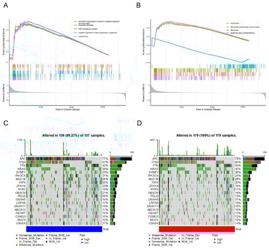Molecular characteristics and CNV of the lncRNA signature associated with 5mC. (A,B) GSEA was utilized to analyze the molecular characteristics of various risk subgroups. (C) A waterfall map was applied to show the mutated genes in the COAD patients of the high-risk group. (D) A waterfall map was applied to show the mutated genes in the COAD patients of the low-risk group.