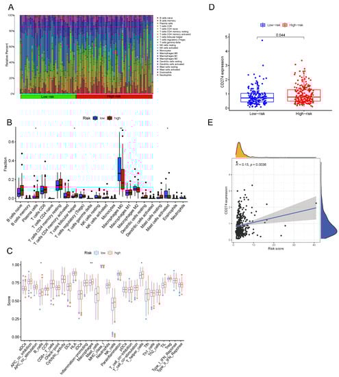 The 22 different immune cells among different risk groups were analyzed utilizing the CIBERSPRT algorithm. As a result, immune cell concentrations showed significant differences among the subgroups (Figure 9A). The risk score was subsequently shown to be positively connected with plasma and T follicular helper cells, whereas macrophages, M0 cells, and active mast cells were negatively correlated (Figure 9B). Next, survival analysis also showed dense infiltration of macrophages M0 cells and activated mast cells correlated with a better prognosis, whereas, high levels of plasma cells were associated with worse survival (Figure A6A–C). We further examined the relationships between risk factors and immunity function. According to the findings, the high-risk subgroup contained more B cells, T cells, and macrophages (Figure 9C). Given the fact that PD-L1 is a well-recognized biomarker for forecasting sensitivity to anti-PD-1/L1 therapy [,,], we examined the levels of PD-L1 expression in various risk groups (Figure 9D,E). These findings indicated that PD-L1 expression was strongly related to risk score and was increased in the high-risk subgroup, which implied that the risk score could act as an indicator of immunotherapy.