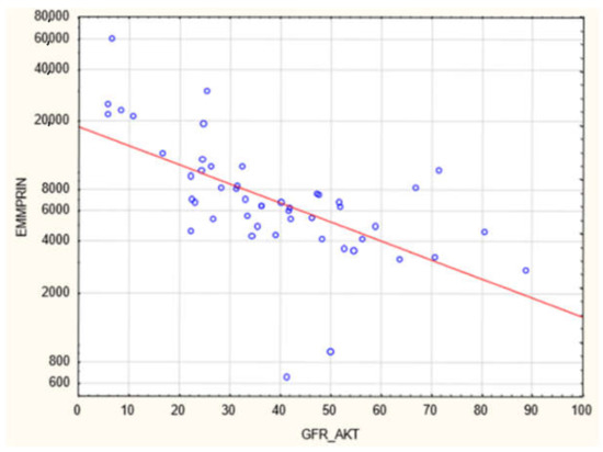 Negative correlation (R = −0.69, p < 0.05) between EMMPRIN/CD147 concentration and eGFR at the most recent appointment (ME 69 months).