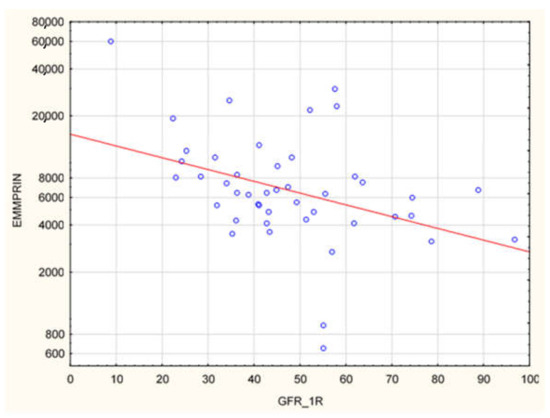 Negative correlation between (R = −0.40, p < 0.05) EMMPRIN/CD147 serum concentration and eGFR at 2 years after renal transplantation.