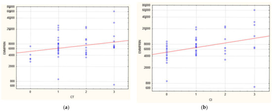 Positive correlation between EMMPRIN/CD147 serum concentration and severity of biopsy specimen lesions such as CI (b) and CT (a) (R = 0.39 and 0.029, respectively, p < 0.05).