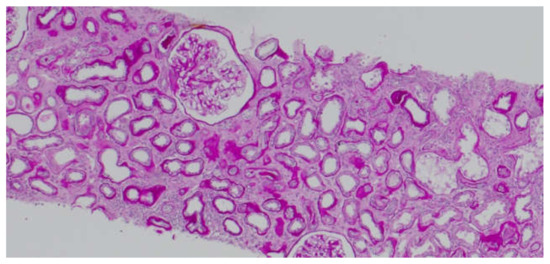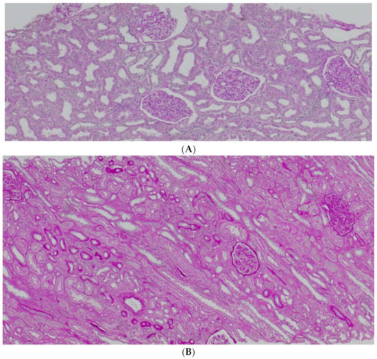 It is known that CD147 abundant in the renal tubules is a very strong activator of MMP-2—the basement membrane-degrading metalloproteinase required for EMT to take place [6]. An in vitro experiment showed that in renal tubular epithelial cells CD147, together with MMP, induces the production of hyaluronic acid, which participates in the differentiation of the tubular epithelial cells into myofibroblasts in response to TGF-β (transforming growth factor β). Hyaluronan promotes the emergence of proteins typical of fibroblasts on the surface of the transforming cells [18]. Similar to AKI, CD147’s role in stimulating inflammatory infiltration by macrophages and monocytes in chronic kidney injury has been proven [19]. CD147 is thought to exacerbate fibrosis following three mechanisms: hyaluronan induction, MMP (particularly MMP-2) induction, and inflammatory infiltration. Our study showed that the concentration of CD147/EMMPRIN correlated negatively with eGFR at the time of sampling—69 months post-Tx on average. The level of serum CD147/EMMPRIN at the end of the follow-up period correlated negatively with eGFR at 1- and 2-years post-Tx, as well. These results prove that its high activity is most apparently linked to worse renal graft function since the very beginning—the early post-transplantation period and at 1- and 2-years post-Tx. Kemmner et al. [6] came to similar conclusions after they analyzed the presence of CD147 in biopsy specimens collected from renal graft recipients (50 months post-Tx on average) in the context of renal graft function and chronic histopathological lesions in the form of IF/TA. They found that abundant CD147 in the biopsy specimen was associated with more pronounced FT/TA lesions, poorer renal graft function evaluated using eGFR values, and an unfavorable change of renal graft function over time [6]. Another researcher, Yoshiko Mori et al., monitored the correlation of urine and plasma CD147 concentrations with renal graft function in patients with different kidney diseases [20]. There is very little information available on EMMPRIN expression in the renal tissue, especially in renal grafts. Most research into this compound is related to cancer and cancer invasion [21]. In many cancers, the effect of EMMPRIN on EMT processes linked to cancer invasion has been proven [21]. EMMPRIN plays a proven role in lung fibrosis secondary to inflammatory diseases [22]. Similar to Kemmner’s results, in our study EMMPRIN correlated positively with IF/TA histopathological lesions. CI demonstrated four degrees of lesion severity (0: ≤5%, 1: 6–25%, 2: 26–50%, 3: >50%), similarly to CT (0: no atrophy, 1: ≤25%, 2: 26–50%, 3: >50%). The more severe interstitial fibrosis and tubular atrophy, the higher the CD147 concentration. Histopathological images of kidney biopsy specimens of two patients with advanced chronic changes in terms of IF/TA have been presented below. In both biopsy specimens, changes have been graded as ci3, ct3, and EMMPRIN concentrations were 12,826 pg/mL and 29,709.47 pg/mL, respectively (Figure 6A,B). Other histopathological images present kidney grafts with no chronic changes. Ci and Ct grades were 0 with less than 5% of the kidney parenchyma being covered with fibrotic changes, and less than 5% of the tubules being atrophic. EMMPRIN concentrations were 3206.734 pg/mL and 897.41 pg/mL, respectively (Figure 7A,B). Another image presents advanced fibrosis (Ci3) with >50% of the kidney parenchyma covered, with <25% of the tubules being atrophic (Ct1). EMMPRIN concentration was 7304 pg/mL in this case (Figure 8).