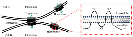 Schematic diagram of a gap junction, hemichannel and connexin. The membrane topology of a connexin protein is shown on the right. NT, N-terminal; EL, extracellular loop; CL, cytoplasmic loop; CT, carboxyl terminal. Green arrows indicate the gap junction and hemichannel pores that allow the passage of small molecules.